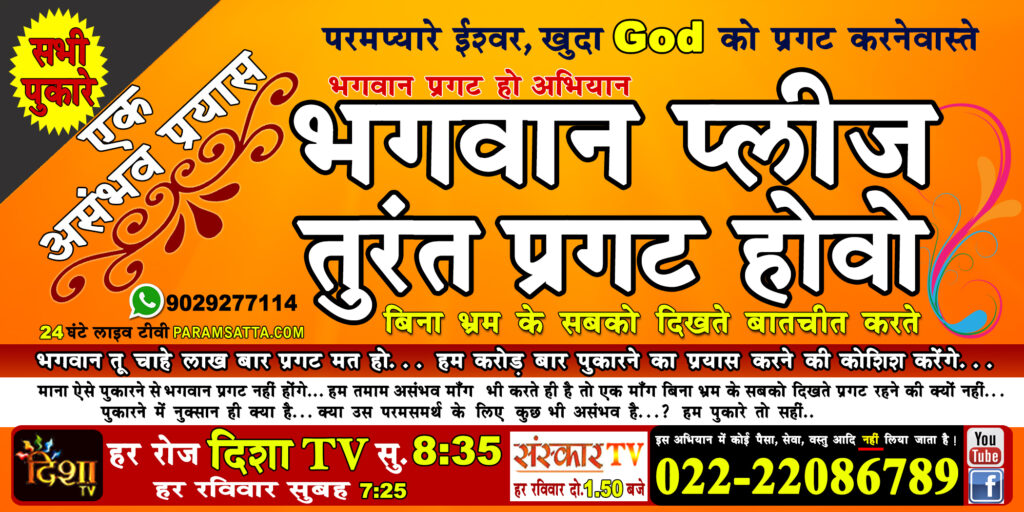 भगवान प्रगट हो... यह केवल मात्र एक पुकार है.. इसमें कोई गुरु, पंडित, मुल्ला-मौलवी, फादर, आदि कुछ नहीं है.. कोई पैसा सेवा आदि कुछ भी नहीं लिया जाता है...इसमें निवेदन है कि भगवान! तू रावण को मारने नहीं.. बल्कि हमारा सबका मां-बाप है इसलिए प्रगट हो.. सबको बिना भ्रम के दिखते.. सबसे बिना भ्रम के बातचीत करते.. सबको बिना भ्रम के गोद लेते.. सबको बिना भ्रम के लाड-दुलार करते.. प्लीज तुरंत सदा-सदा के लिए प्रगट होवो.. ...भगवान से विशेष निवेदन की पहले हमारे भाई साहब यानी आपश्री को पहले दिखना...अगर किसी एक को भी छोड़ना हो... तो भगवान उसे छोड़ने से पहले मुझे छोड़ देना... भगवान हरएक - हरएक को बिना भ्रम के दिखते please तुरंत प्रगट होवो... भगवान प्लीज तुरंत प्रगट होवो... अधिक जानकारी हेतु आप हमारे 9076006700 नंबर पर contact कर सकते हैं..